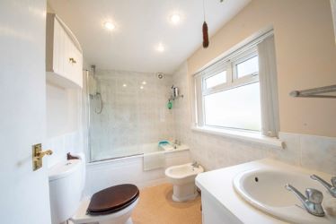 BATHROOM 8′ 7" x 5′ 5" (2.62m x 1.67m) Family bathroom with grey marbled tiles to water sensitive areas and white suite including bath with shower overhead, toilet and bidet.