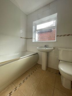 UPVC double-glazed window to side. Tiled flooring. Radiator, W.C. basin with mixer tap and bath with shower over. Tiled splashbacks. Ceiling light point.