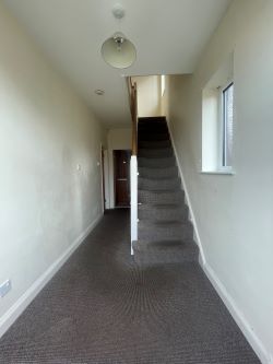 UPVC double-glazed French doors to front. UPVC double-glazed window to side. Thermostat. Ceiling light point, Carpeted, Radiator. Stairs off to first floor. Understairs store.