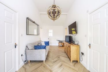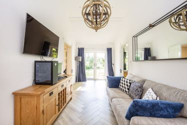 Lounge 19' 7'' x 8' 3'' (5.98m x 2.52m) With Herringbone Karndean flooring, uPVC double glazed double doors leading to private established South facing woodland gardens to rear and a panelled door leads to: