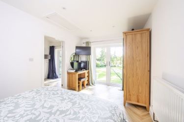 Bedroom 14' 7'' x 9' 1'' (4.44m x 2.76m) With recessed ceiling lighting, radiator and uPVC double glazed double doors to rear gardens.