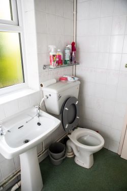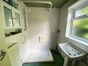 Bathroom 7' x 5'5" (2.13m x 1.65m). Textured window to rear. Central heating radiator. Bathroom suite comprising of a low level w.c. Pedestal wash hand basin. Shower cubicle. Tiled walls.