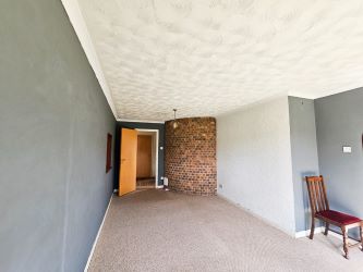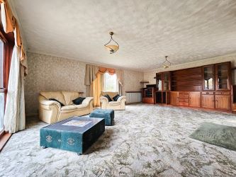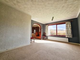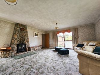 The spacious lounge with its log burner set within a brick effect surround, accompanied by carpet flooring and a wall-mounted radiator, while a large sliding patio door allows access to the rear garden. Additionally, a large double-glazed window graces the front elevation, offering delightful views of the well-maintained front garden. The lounge transitions into the adjacent dining room through an arch entrance providing an ideal space for entertaining and relaxation.