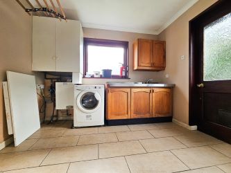 The utility room offers practicality with tiled flooring, wooden base and eye-level units, and a stainless steel sink with a mixer tap, along with built-in storage cupboards and also houses the Worcester boiler. The double-glazed window overlooks the side garden, while a brown wooden frosted glass-panelled door provides easy access to the rear garden.
