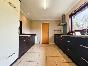 The kitchen features tiled flooring, wooden base units, and cream eye-level cabinets complemented by black worktops. Equipped with modern appliances including a double stainless steel sink with mixer tap, built-in double Siemens oven, Siemens four-ring electric hob, Siemens built-in dishwasher, and extractor fan, along with a built-in fridge. The kitchen includes a serving hatch into the dining room, while a large double-glazed window provides scenic rear views. Additionally, a door leads to the utility room.