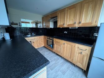 Attractively fitted with a good range of wood fronted units to 3 wall areas, laminated work surfaces with inset sink unit, tiled surround to work areas, integrated oven, 4 ring hob, filter hood and dishwasher, space for further window appliances, full width double glazed window enjoying similar views to Living Room.