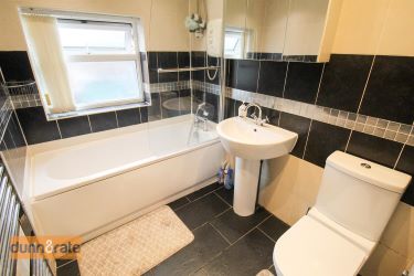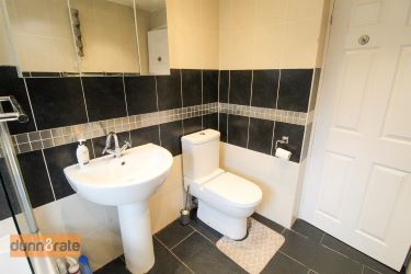 A double glazed window overlooks the rear aspect. Fitted with a suite comprising bath with shower over, low level W.C and wash hand basin. Fully tiled walls and ceiling spotlights. Ladder style towel radiator.