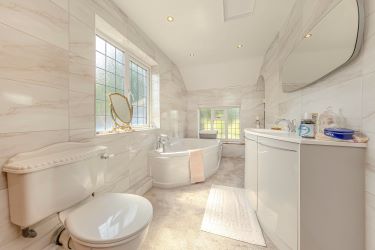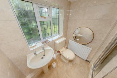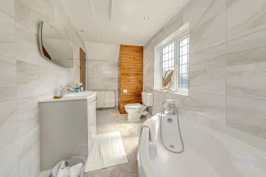 Family Bathroom - Spacious family bathroom comprising; panelled bath with telephone style shower off the taps, low level WC and wash hand basin with with cupboard below. Built in storage cupboards. Access to the loft space. Spotlights. Tiled walls. Two double glazed windows. Radiator.