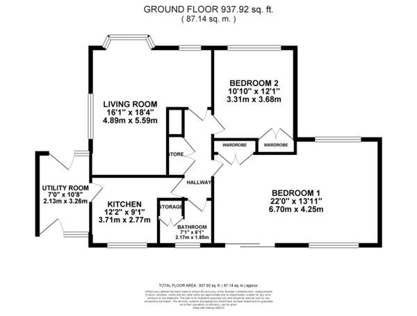 Extending to approximately 937 sq. ft. (87 sq. m.), the accommodation briefly comprises a bright and airy living room, kitchen with adjoining utility room, two well-proportioned bedrooms — the principal measuring an impressive 22ft — and a family bathroom. There is also useful storage throughout.