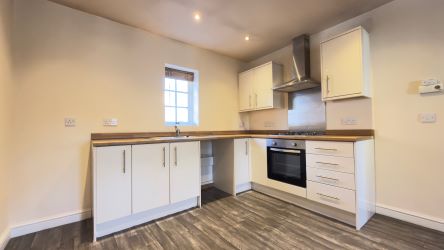 Comprising of open plan lounge/ kitchen with cream gloss kitchen and wood worktop, integrated oven-hob-hood.