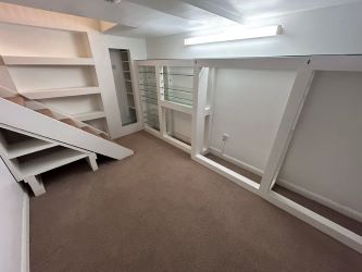 Range of built in storage cupboard with shelves, dressing table and display niches, electric panel heater, exposed ceiling timber.