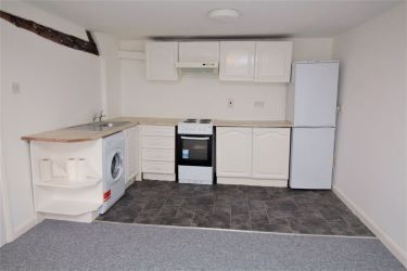 Living Area is carpeted. Exposed wall timber, wall mounted electric heater, window to the front. Kitchen Area has vinyl flooring, fitted with white painted base and eye level units, laminated work tops, inset sink unit, space for appliances.