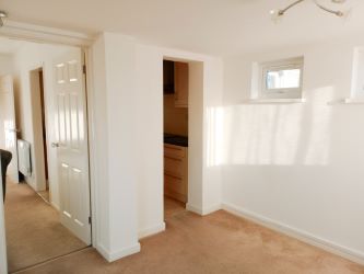 A bright and welcoming living space, enhanced by a double-glazed bay window to the front elevation. The room offers multiple power points, a wall-mounted heater, and provides access through to the bedroom.
