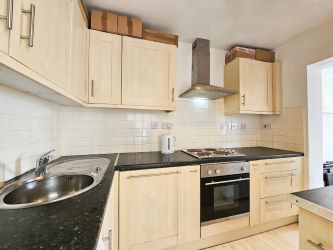 Fitted kitchen with a range of cupboards and wall units, oven and electric hob with extractor over. Plumbing for a washing machine.