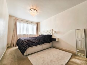 A generously sized double bedroom featuring a double-glazed UPVC window to the front, built-in storage cupboard, wall-mounted heater, and multiple power points.